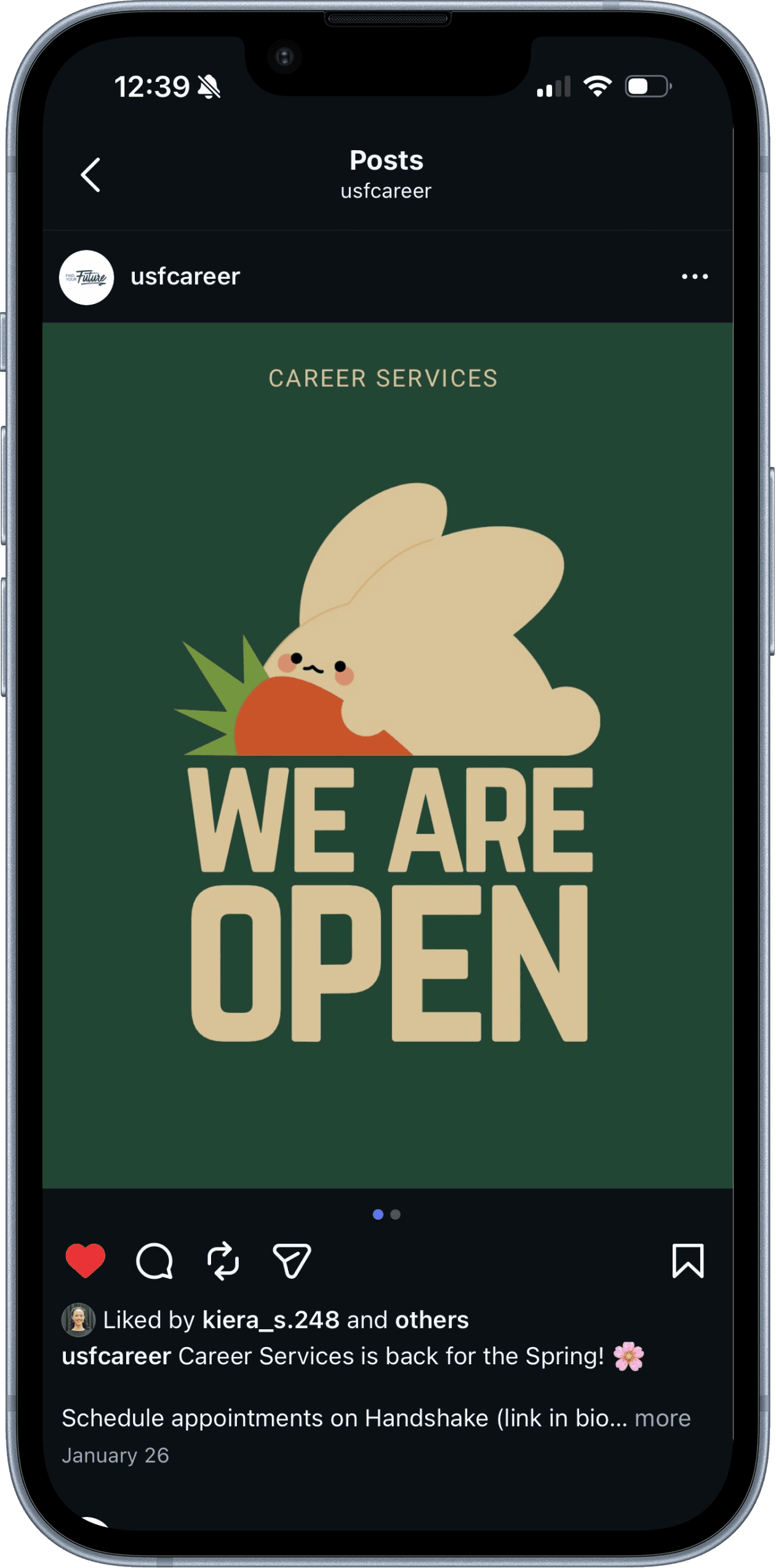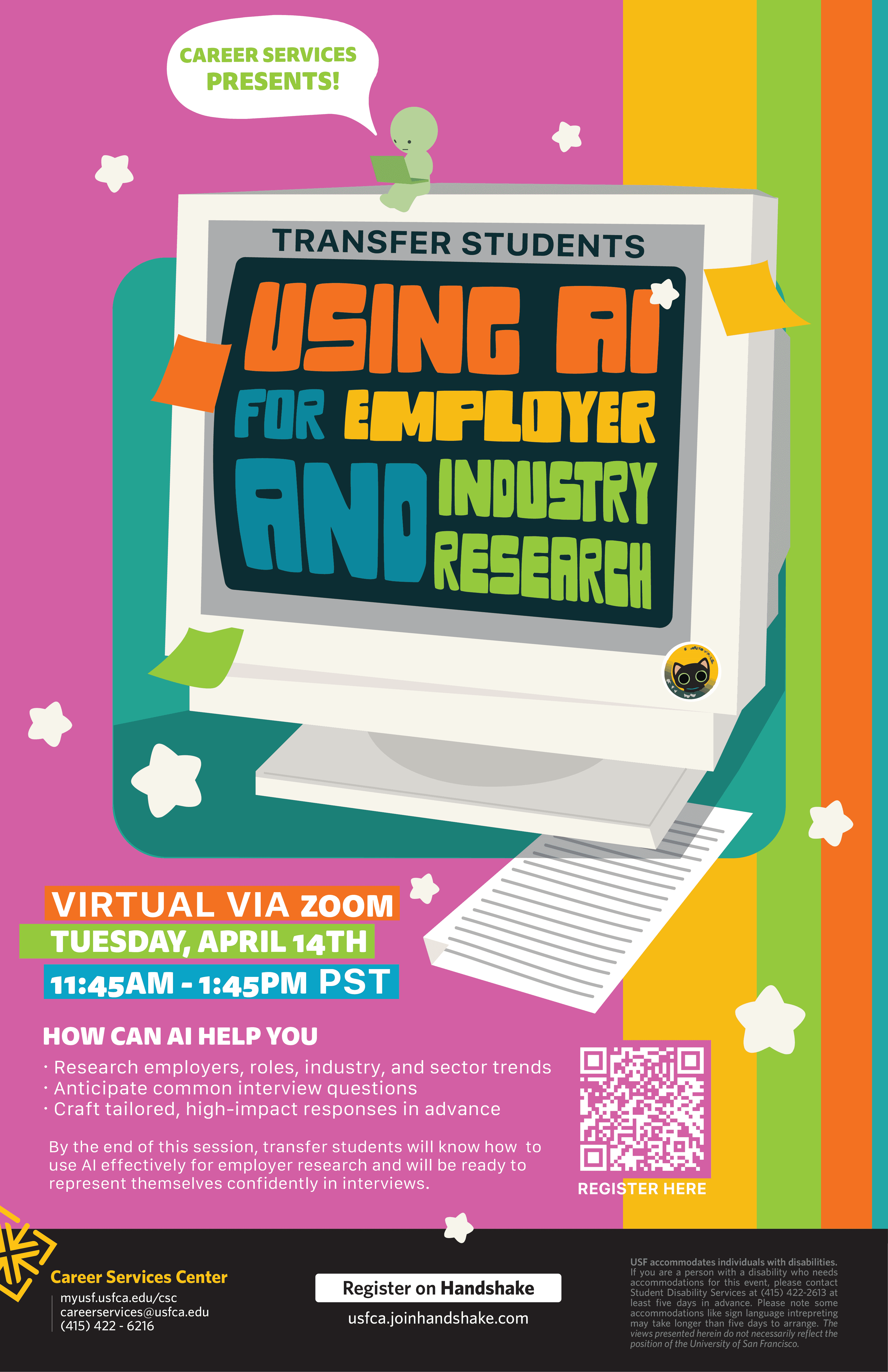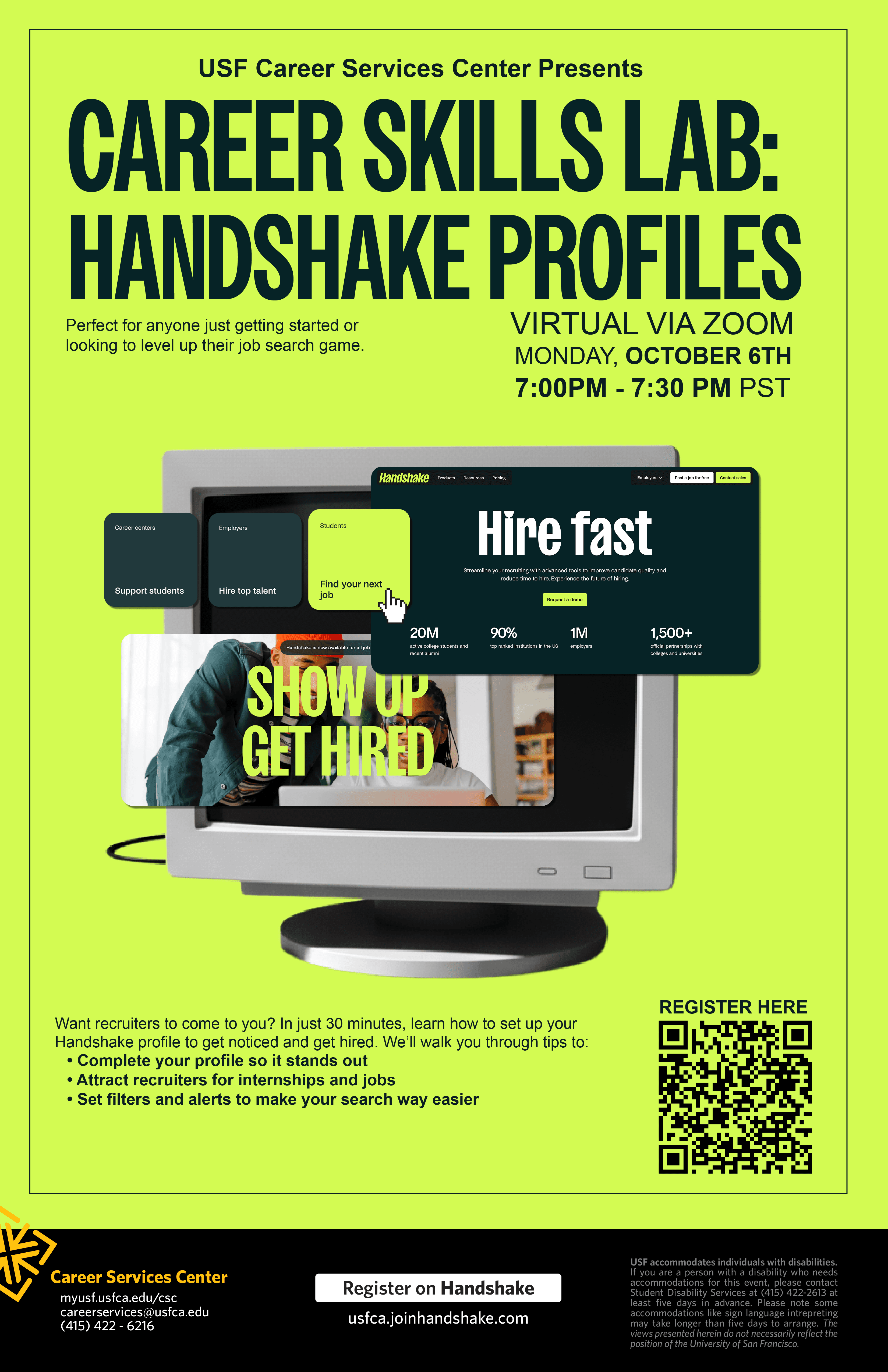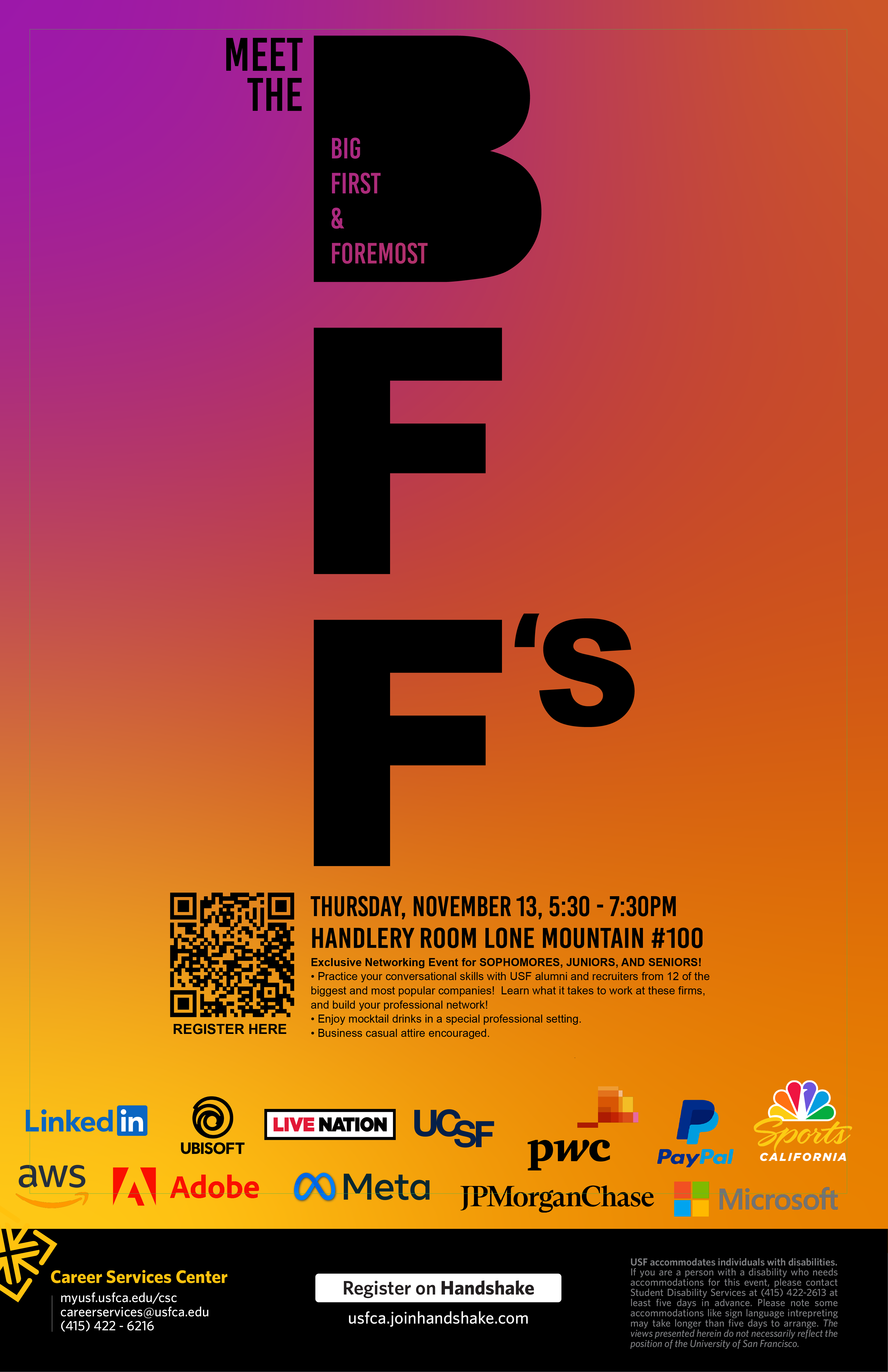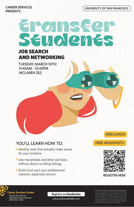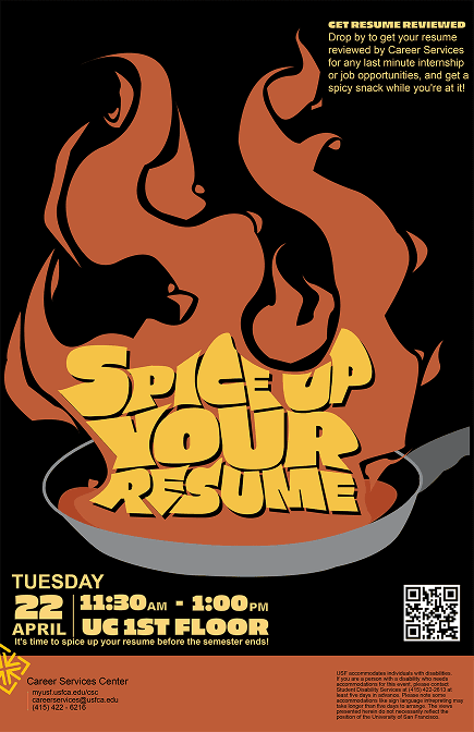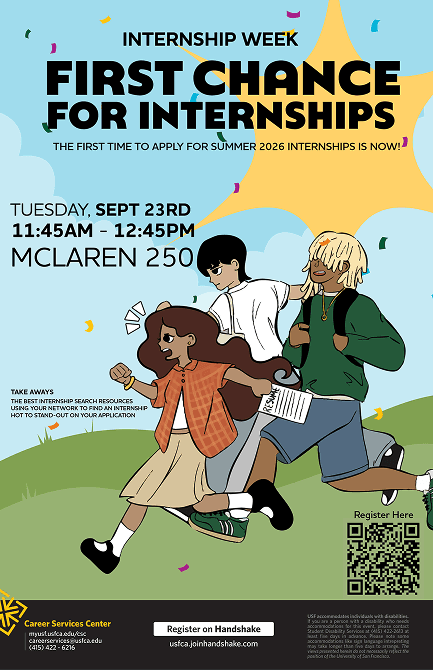 As a Graphic Design Assistant II at The University of San Francisco's Career Services, I produced print and digital materials — including event flyers, posters, and brochures — while adapting designs across multiple formats and sizes to maintain visual consistency across both print and digital channels.