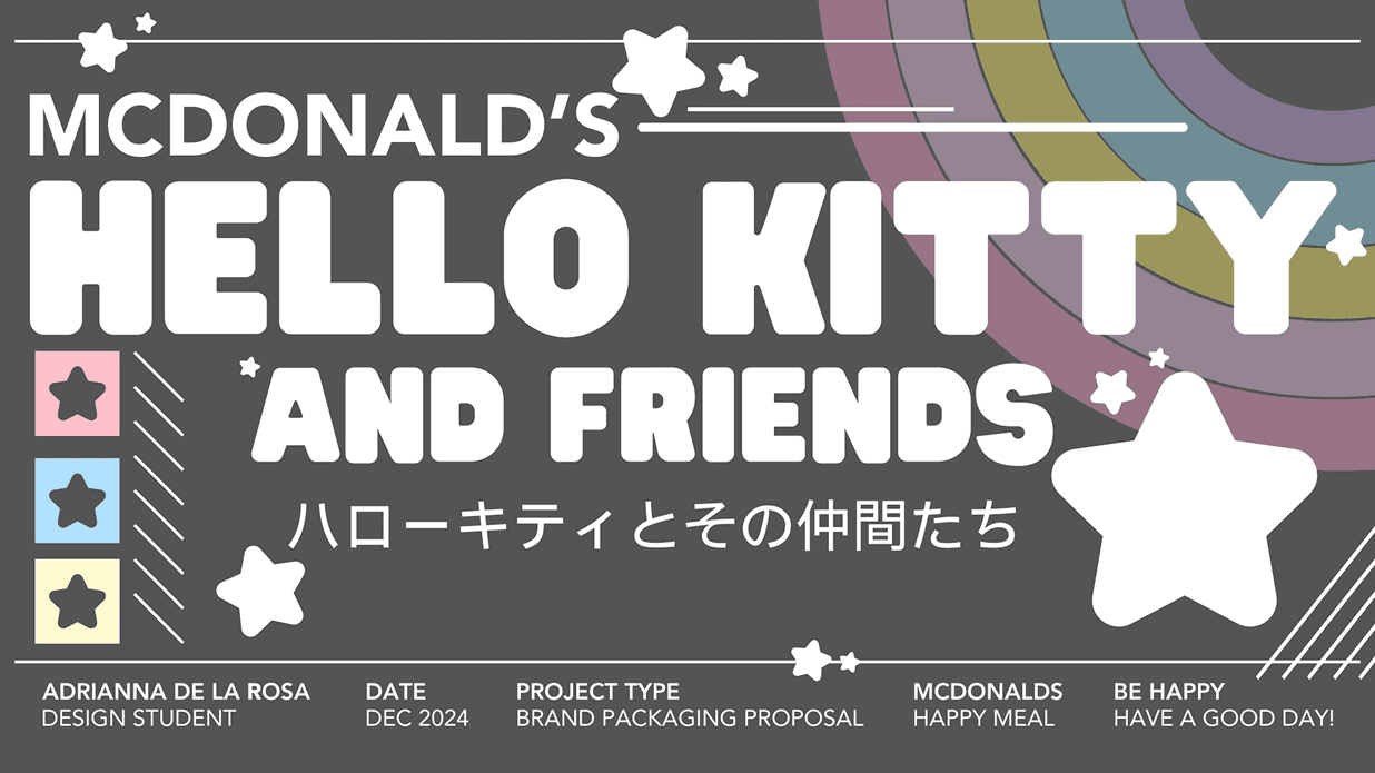 This proposal envisions a collaboration between McDonald’s and Sanrio to create a special edition of the Happy Meal featuring Hello Kitty and her friends. The design integrates Sanrio’s soft pastel palette while maintaining McDonald’s iconic vibrant red, symbolically tied to Hello Kitty’s signature bow.